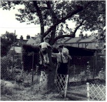 with virtually no money, £100, which actually wiped us out of our savings. The picture shows the garden of 24 Carterhatch Rd with Steven climbing the apple tree and Brian with baby Jane over his shoulder. The Apple tree was later removed. |